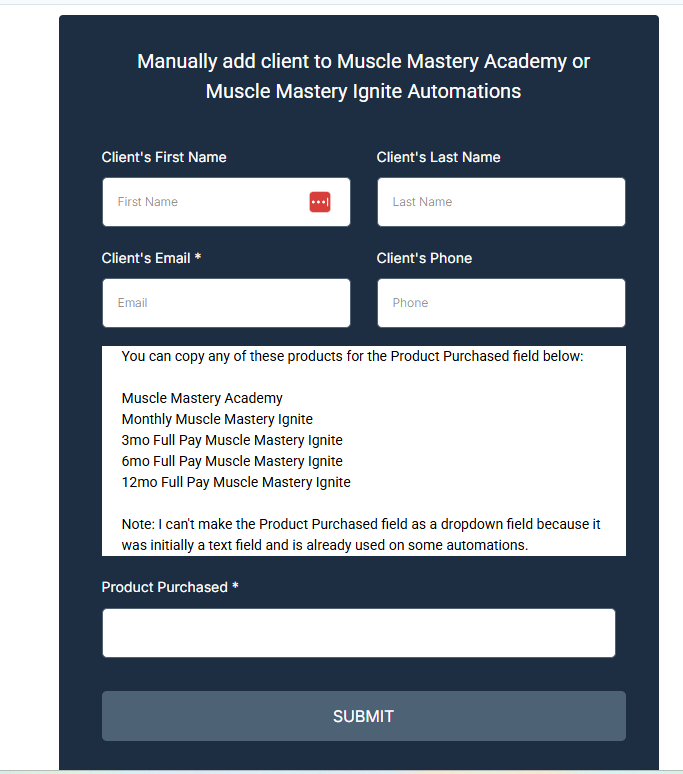 - Fill out and complete the Manually Add Member to Muscle Mastery Academy/Muscle Mastery Ignite Automations form.