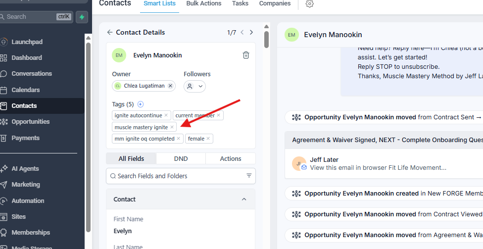 5. If you see the Muscle Mastery Ignite tag, then this means that the client was added to the automation successfully.